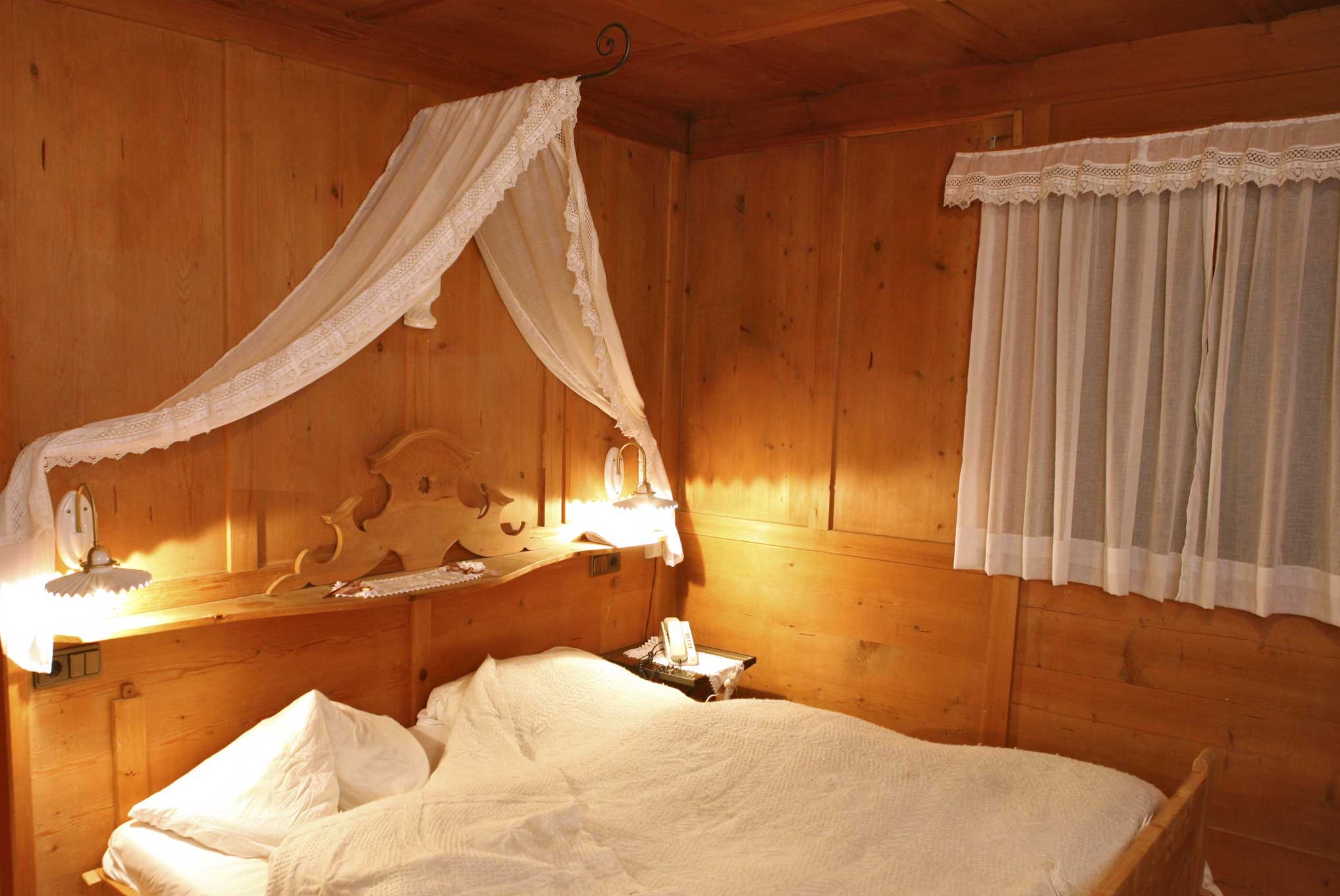 A beautiful double room panelled in larch wood, a small hallway with a desk and sofa, large shower & WC with bidet in wood style, natural light, and a view of the mountains, satellite LCD TV, safe, and a large balcony.